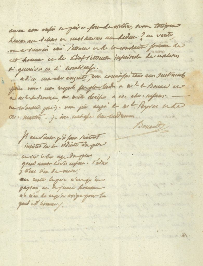 L.A.S., mercredi soir [1814 ?], à son frère Auguste de Bonald, à Rodez (Aveyron) ; 2 pages in-4, adresse. Recommandation du fils aîné du « plus grand propriétaire de notre paroisse », le sieur Causse de Longuers, veuf chargé de neuf enfants, dont le deuxième « etoit dans les grenadiers de la garde, il n’en a pas eu de nouvelles depuis le mois d’avril 1812 [...] Je n’ay pu à Paris savoir ce qu’il etoit devenu et je ne doute pas qu’il n’ait péri dans la campagne de Russie. À present on demande l’aîné pour les gardes d’honneur, l’aîné qui est présent à l’armée puisqu’il y a un remplaçant qui lui a couté 8000ll. Cette maison où il y a un gros bien et d’une exploitation penible seroit perdue si on prenoit ce jeune homme »... Étant déjà intervenu auprès du préfet pour Léopold de Péquinolles, il ne veut encore écrire pour celui-ci, « mais j’ay pensé que vous lui serviriés de patron, et qu’il vous seroit permis de faire valoir des moyens legitimes d’exemption »... Il s’interroge ensuite sur les grands succès qui pourraient tourner à leur avantage : « Aurons nous enfin la paix à force de retraites [?], serons [nous] toujours heureux au-dehors et malheureux au-dedans ? En vérité, on ne scaurait assés s’étonner et de la constante fortune de cet homme et de l’éternelle infériorité de nations si guerrières et si nombreuses »...